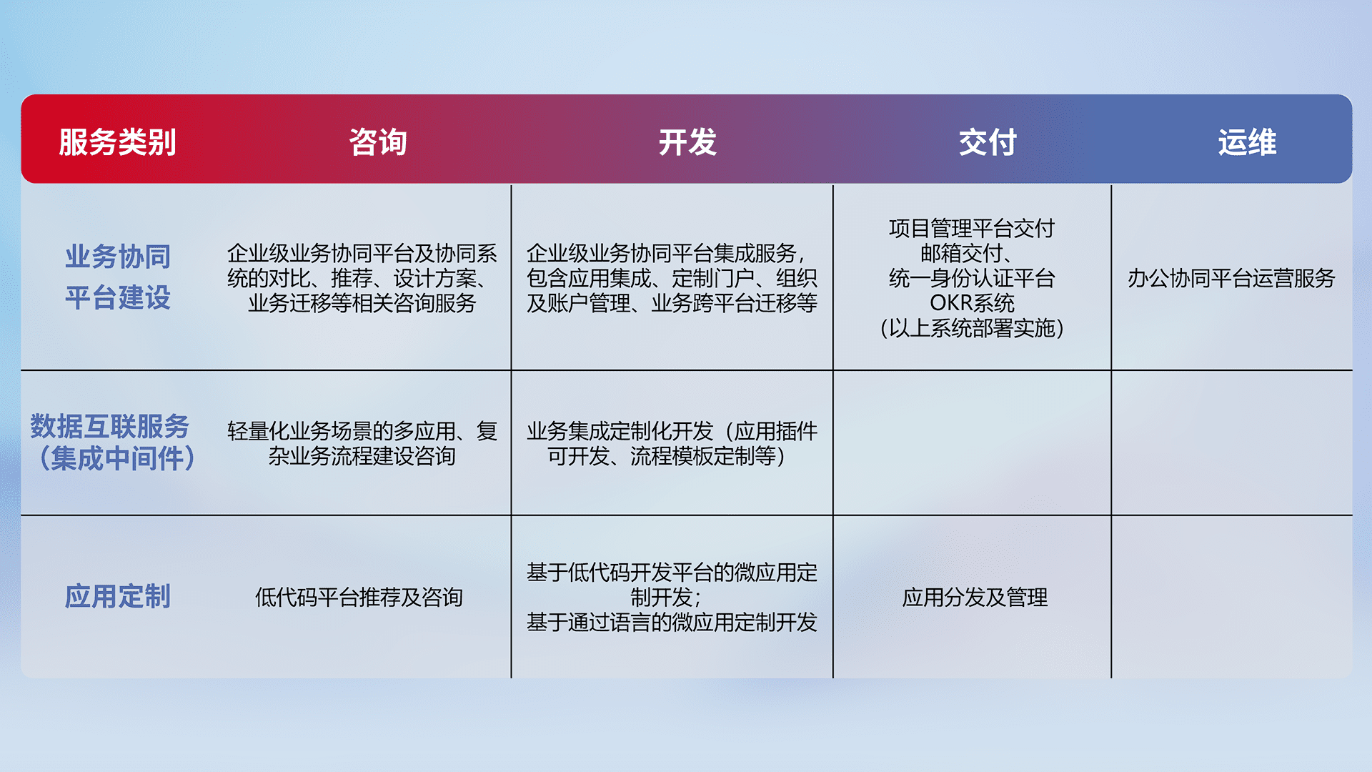 针对钉钉、、企微、、IDaas等平台级产品提供产品的规划、、方案、、交付、、定制化开发等服务,,,,实现如统一协同办公、、智能客户服务、、、混合会议管理、、、、智能数据查询、、、、等业务场景,,,,实现数字化转型。。。